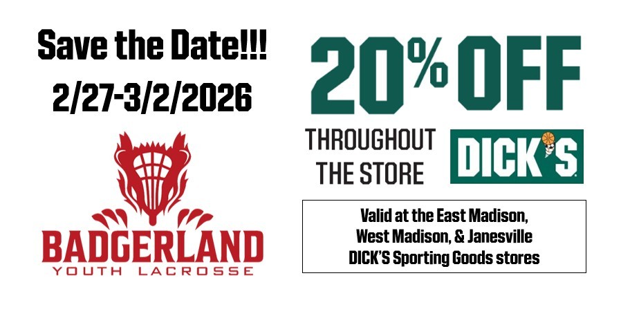 DICK’S Sporting Goods will be hosting a 20% off shop event for all Badgerland Lacrosse clubs, athletes, and coaches at the East Madison, West Madison, & Janesville stores on 2/27-3/2/2026.